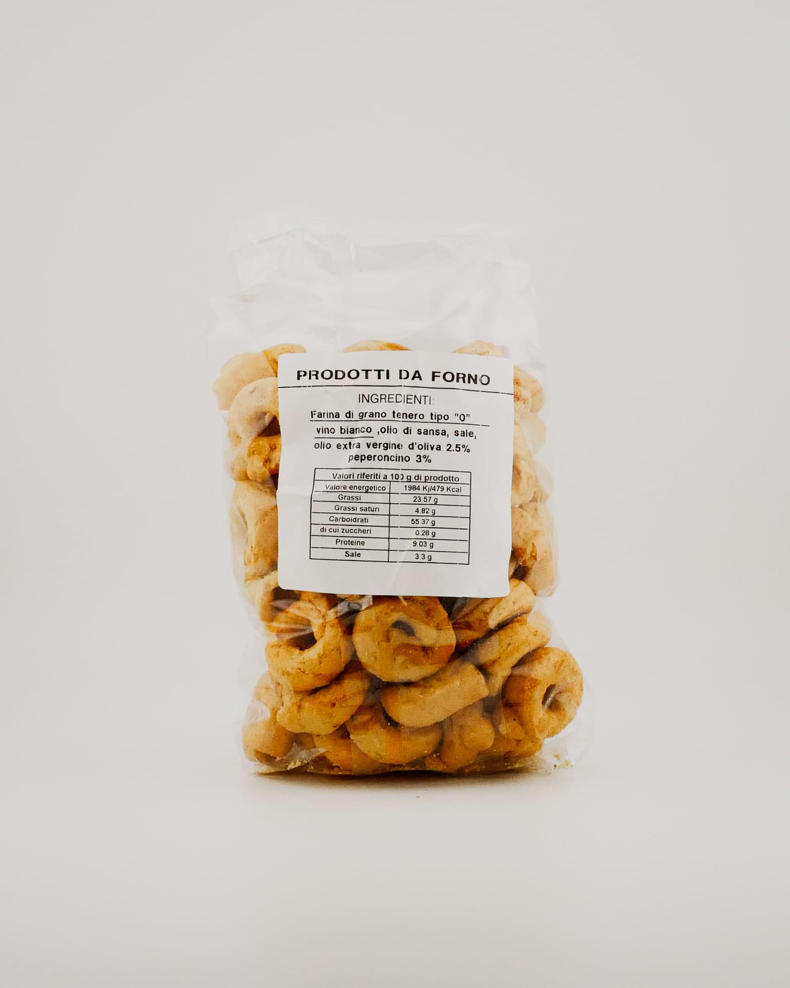Classic Puglian snack. Hand-rolled, boiled, then baked for that signature crunch & added spice. Made with olive oil and simple ingredients. Perfect with cheese, wine or cured meats.